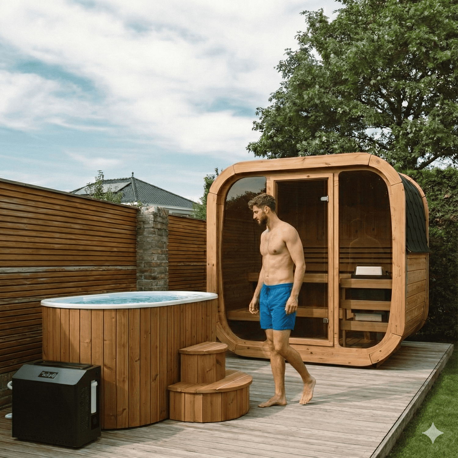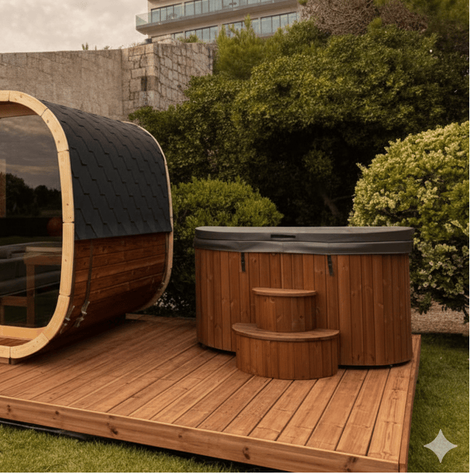 Modern aesthetics in Thermowood or Black finishes, suitable for indoor and outdoor wellness spaces.